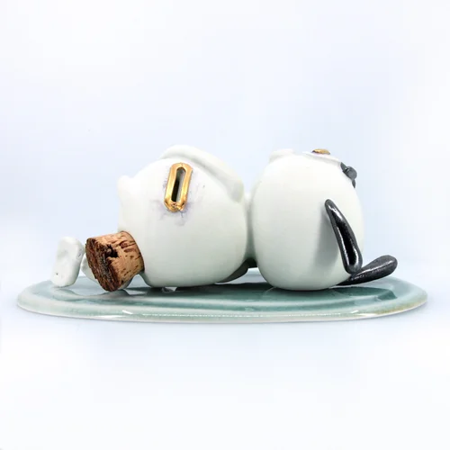 Bank is a play on the conventional piggy bank, complete with coin slot and cork stopper but the belly is exposed, ribs and all, and thus renders the act of saving as a conundrum. What are we saving for later?